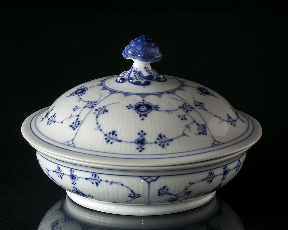 Royal Copenhagen Musselmalet Gerippt Terrin mit Deckel. Die aktuell produzierte Version des geriffelten Musters wurde 1885 von dem Architekten Arnold Krog für Royal Copenhagen entworfen. Ursprünglich stammt das Dekorationsmuster aus China. Später im selben Jahr schuf er die Halbspitze und Vollspitze Dekorationen.