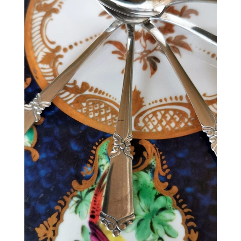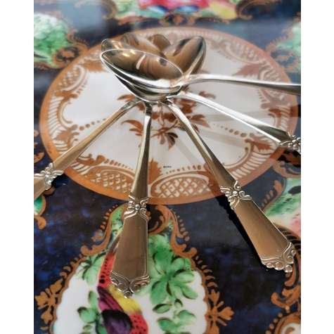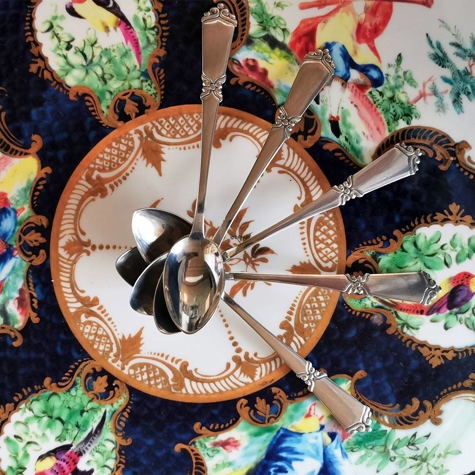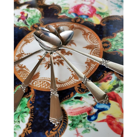 5 Teelöffel aus Sterlingsilber mit süßer Verzierung in der Mitte und am oberen Ende des Löffels.