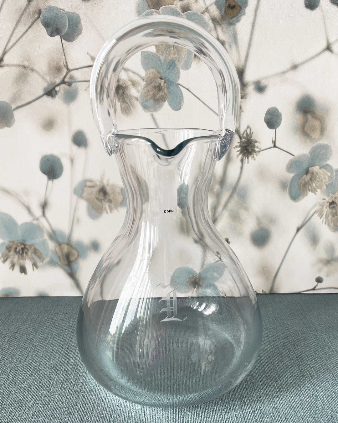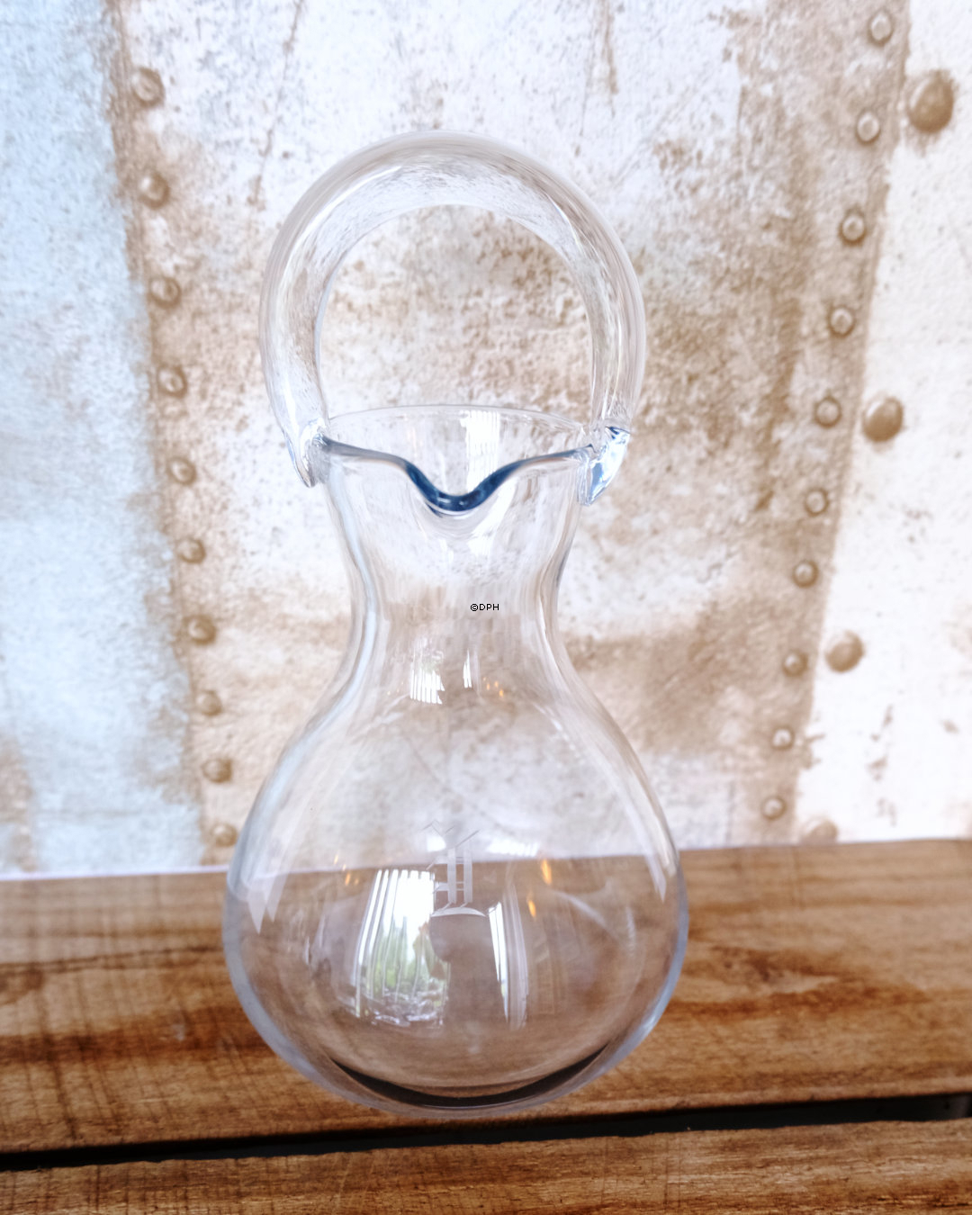 Glaskaraffe mit kleinem Ausgießer und festem, rundem Griff. Kleines diskretes Logo auf der Vorderseite.