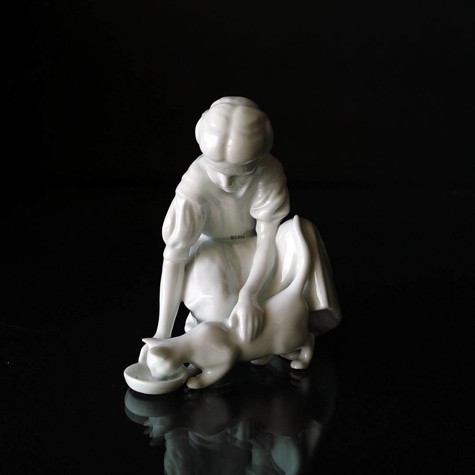 Royal Copenhagen Figur des Mädchens mit Katze, die trinkt, glasiert. Im Jahr 2008 lancierte Royal Copenhagen einige der bekannten Figuren in weißer Farbe. Unter diesen Figuren finden wir diese Royal Copenhagen Figur "Nur ein Tropfen", die ursprünglich von Ingeborg Plockross Irminger entworfen wurde.