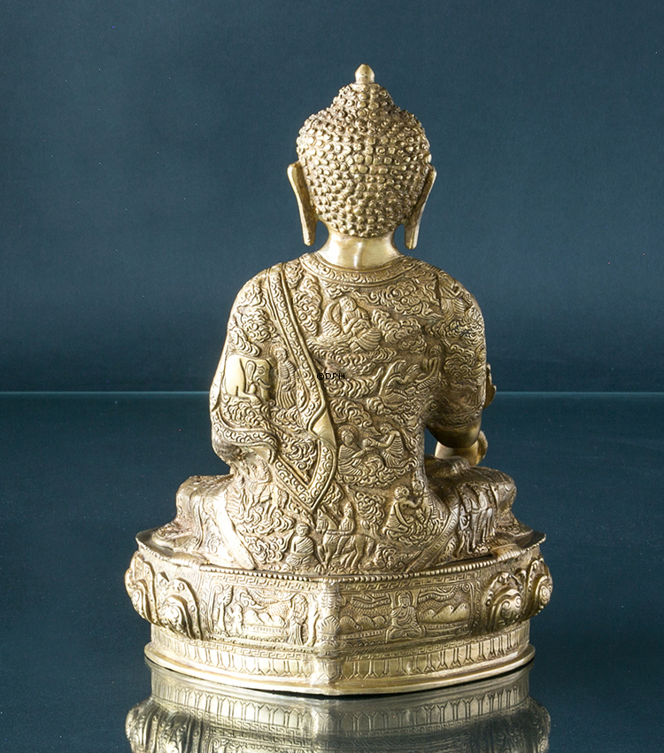 Buddha in Varada Mudra. Wenn Buddha in dieser Stellung sitzt, symbolisiert es seine Wohltätigkeit und Mitleid. Dieser ist auch der Medizinbuddha, der Wissen über Medizin um Krankheit zu heilen gibt. Symbolisch repräsentiert dieser Buddha Wohltätigkeit und Gesundheit. Material: Messing