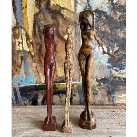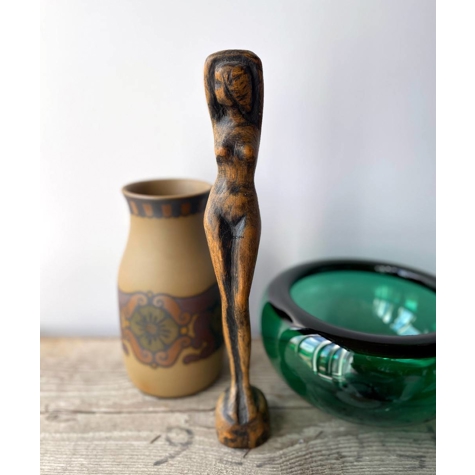 Bereits in den frühen Phasen seiner Karriere verwendete er Holz als bevorzugtes Material, um seine charakteristischen und zarten weiblichen Figuren zu schaffen, für die er bekannt ist. Dieses spezielle Stück bildet da keine Ausnahme.