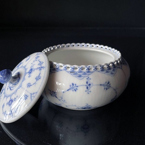 Seltene Royal Copenhagen Musselmalet Vollspitze Bonbonniere mit Deckel. Kann als Zuckerdose für Streuzucker oder als Schale mit Deckel verwendet werden.