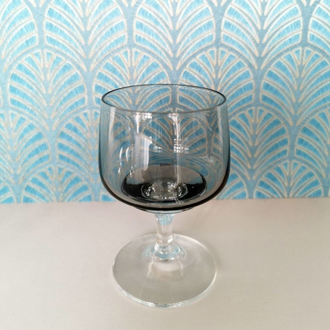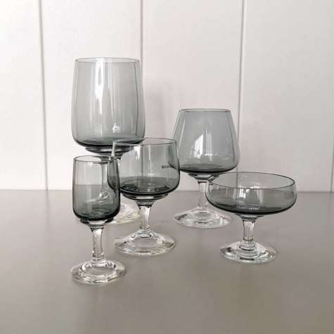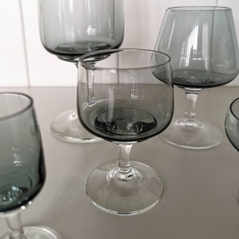Holmegaard Atlantic (Atlantis) Weingläser sind aus blaugrauem getöntem Glas mit transparentem Stiel und Fuß gefertigt. Die Gläser wurden von Per Lütken im Jahr 1962 entworfen und die Produktion wurde 1975 eingestellt.