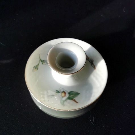 Porzellangeschirr auf cremefarbenem Untergrund mit Goldrand und schönen Jasminblumen.