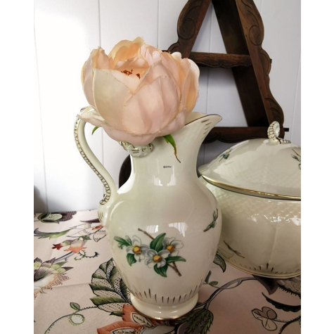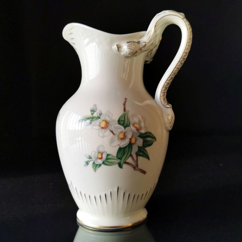 Porzellangeschirr auf cremefarbenem Untergrund mit Goldrand und schönen Jasminblumen.
