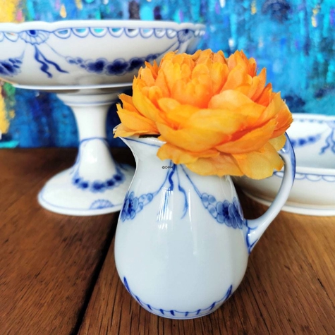 Empire Essgeschirr und Kaffeegeschirr wurde von Bing&Groendahl produziert. Empire Geschirr wurde von Harriet Bing entworfen, die mit einem der beiden Brüder verheiratet war, die Miteigentümer der Bing&Groendahl Fabrik waren. Das Empire Geschirr zeichnet sich durch die weiße Grundfarbe mit Skalenrand und seine wunderschön geschwungenen blauen Dekorationen aus Blumen und Seepferdchen aus.