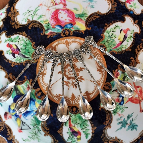 8 Teelöffel / Kaffeelöffel mit süßen Blumendekorationen auf jedem einzelnen. Die Blume variiert von Löffel zu Löffel.