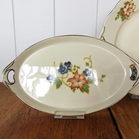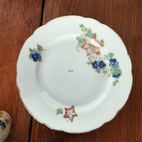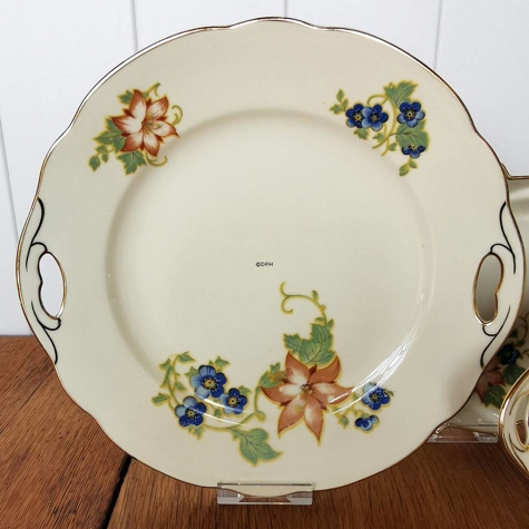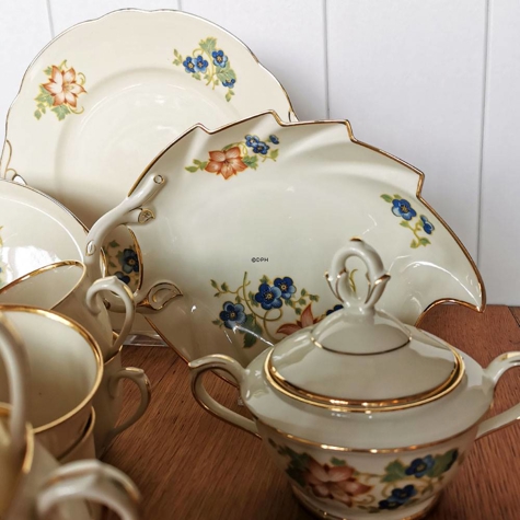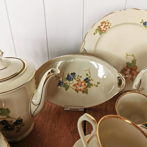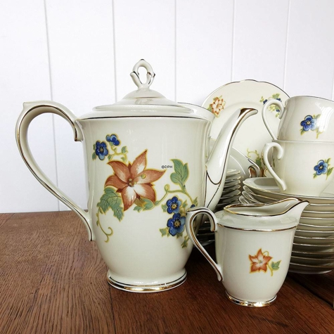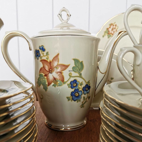 Capri Kaffeeservice mit Motiven von braunen und blauen Blumen mit grünen Blättern auf creme-farbener Grundlage mit Goldrand. Das Service wird als Ganzes verkauft und besteht aus: