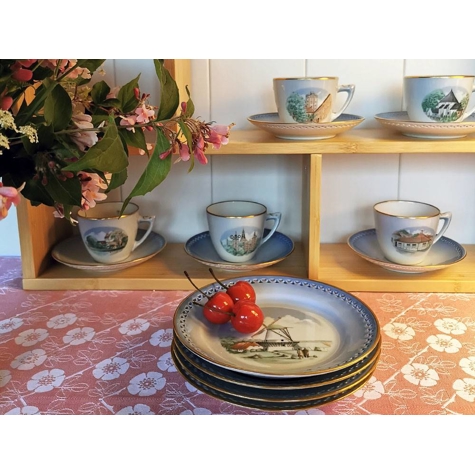 Es wurden 12 verschiedene Sets mit Motiven berühmter dänischer Attraktionen produziert. Dies ist der zweite Satz mit Motiv Düppeler Mühle auf dem Kuchenteller. Neben den 12 Kaffeetassen-Sets beinhaltet das Geschirr auch einen großen Kuchenteller, Kaffeekanne, Teekanne, Milchkännchen und Zuckerdose.