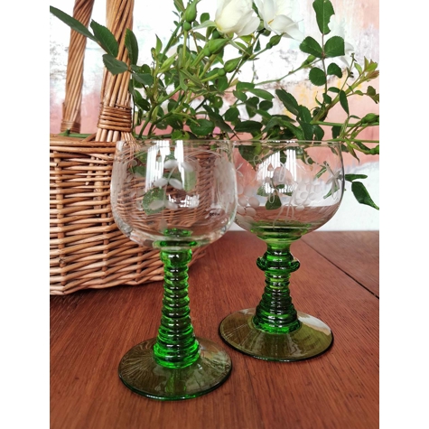 Schönes Weinglas mit grünem Stiel und eleganten Schliffen am Glas selbst