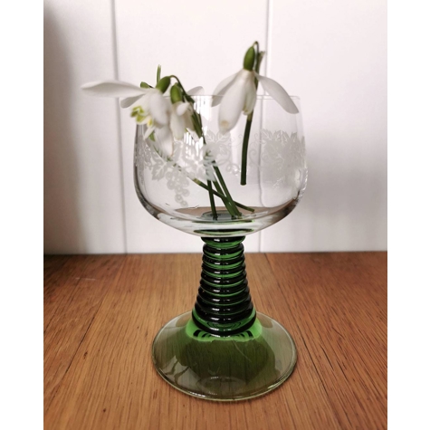 Schönes Weinglas mit grünem Stiel und eleganten Schliffen von Weinreben mit Blättern am Glas selbst
