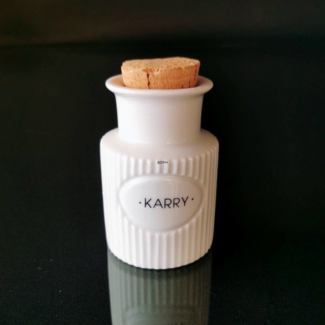 Dieser Currykrug ist Teil einer größeren Serie, die Krüge für die Aufbewahrung einer Vielzahl von Gewürzen wie Basilikum, Thymian, Estragon, Fenchel, Ingwer, Zimt, Majoran, Vanille, Paprika, Nelken, Backpulver, Salz, Muskat, Kreuzkümmel und Pfeffer umfasst, was das Organisieren und stilvolle Gestalten Ihrer Küche erleichtert.