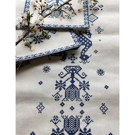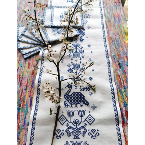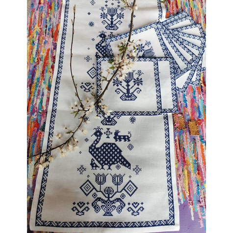 Bestickte Tischläufer und Platzsets mit blauem Muster