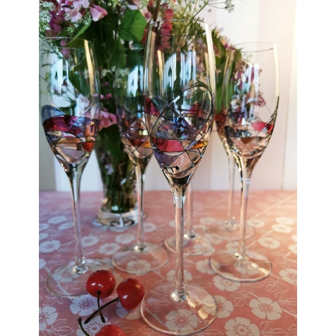 6 Stück Papillon / Cara Grande Tiffany Champagnergläser. Klares Glas mit schöner Dekoration in verschiedenen Farben.