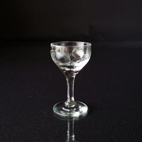 Süßes kleines Glas für Portwein mit Dekoration von Weintraubenrispen und Weinranken.