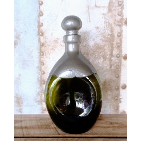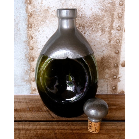 Dreieckige Karaffe aus grünem Glas mit Korken. Die Flasche ist in der Mitte zusammengedrückt und mit Zinn oben auf der Flasche und auf dem Korken beschichtet.
