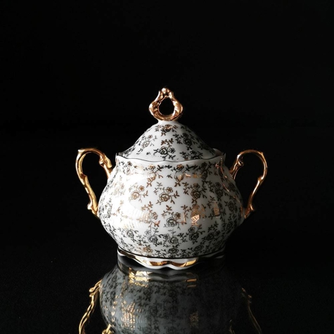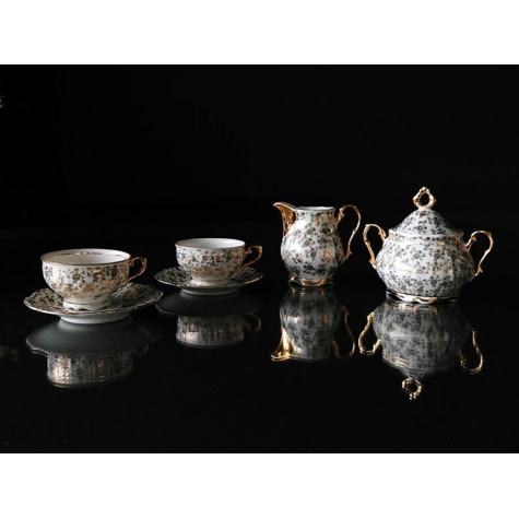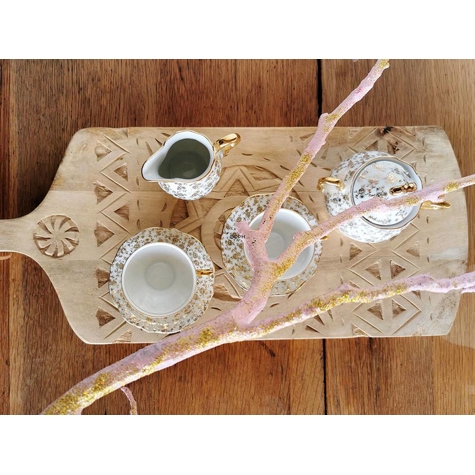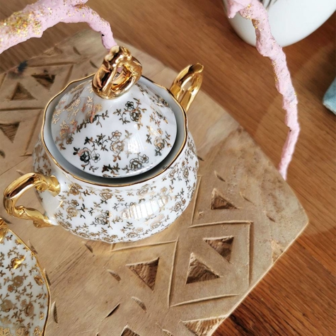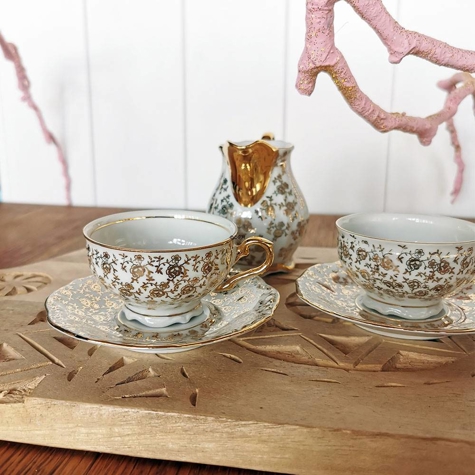 Süßes kleines Teeservice / Espressoservice bestehend aus 2 Tassen mit Untertassen sowie einer passenden Zuckerdose mit Deckel und einer Sahnekännchen.