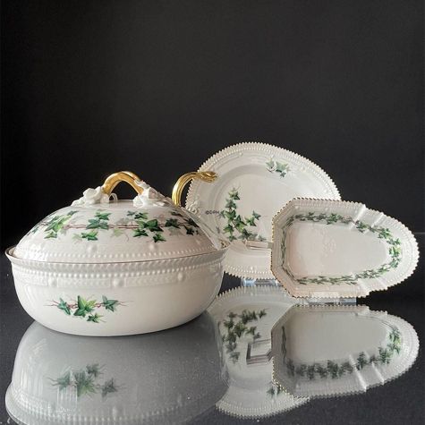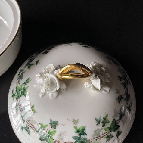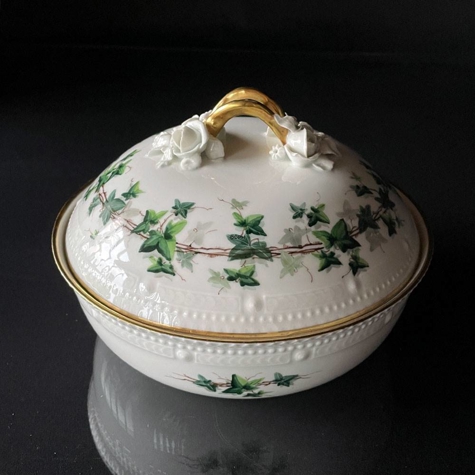 Statt der klassischen Blumendekorationen schmückt dieses Stück ein wunderschönes Efeumotiv, das sowohl die Schale, den Deckel als auch das Innere der Schale ziert. Zusätzlich ist die Schale mit edlen Goldverzierungen an den Rändern und Griffen versehen, was ihr eine exklusive und einzigartige Note verleiht. Ein wahrer Schatz für Sammler und Liebhaber von Royal Copenh agens künstlerischen Meisterwerken.