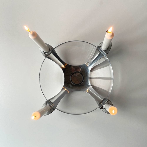 Schöner Stelton Adventskerzenständer für normale Kerzen mit Platz zur Dekoration in der Glasschale in der Mitte des Ständers