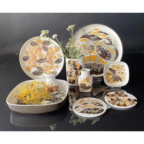 Royal Copenhagen Teelichthalter mit Gelber und Brauner Verzierung. Die Teelichthalter ist Teil der Siena-Serie, das ist ein Royal Copenhagen Art Fayence-Serien, die von den Künstlern erstellt wurden Ellen Malmer und Ivan Weiss, also das sie auf einer gemeinsamen Formbasis und in der gleichen Farbskala, hat Dekorationen geschaffen für schöne Vasen und Geschirr.