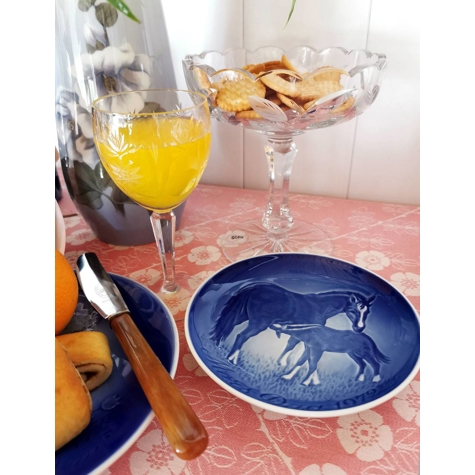 1972 Bing&Gröndahl Muttertagsteller mit dem Titel Pferd mit Fohlen wurde von Henry Thelander entworfen. Das Motiv des 1972 Bing&Gröndahl Muttertagstellers zeigt ein Pferd mit Fohlen in einer schönen Szene auf dem Feld. Eine Stute bringt ein Fohlen zur Welt. Zwillinge sind sehr selten und wenn es passiert, wird einer der Zwillinge wie gewöhnlich schwach sein. Fohlen spielen gerne miteinander und es ist für sie nützlich, zusammen mit anderen jungen Pferden sowie älteren Pferden aufzuwachsen, die sich um die Erziehung kümmern können. Die Bing&Gröndahl Muttertagsteller erschienen 1969 und werden jedes Jahr mit einem neuen Muttertagsteller weitergeführt.