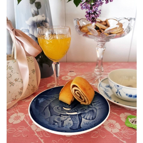 1986 Bing&Gröndahl Muttertagsteller mit dem Titel Elefant mit Elefantenkalb wurde von Henry Thelander entworfen. Das Motiv des 1986 Bing&Gröndahl Muttertagstellers zeigt einen Elefanten mit ihrem Elefantenkalb. Wenn der junge Elefant ein Mädchen ist, wird es ihr möglich sein, in der Herde zu bleiben. Die Herde besteht aus einem alten weiblichen Elefanten, ihren Töchtern und ihren Töchtern. Die männlichen Elefanten müssen die Herde verlassen und zusammen mit anderen männlichen Elefanten oder alleine gehen. Die Bing&Gröndahl Muttertagsteller erschienen 1969 und werden jedes Jahr mit einem neuen Muttertagsteller weitergeführt.