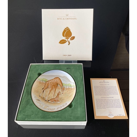 Um das Jubiläum des Bing&Gröndahl Muttertagstellers zu feiern, hat die Fabrik diese limitierte Auflage des Muttertagstellers herausgegeben. Der Teller ist in zarten Farben auf der Glasur handbemalt. Das Motiv ist eine Giraffe mit Kalb.