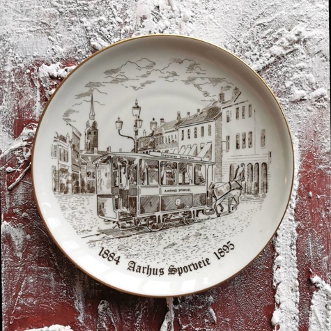 Bing&Gröndahl Teller mit brauner Zeichnung Motiv: Aarhus Straßenbahnen Text auf Teller 1904 Aarhus Sporveie 1971