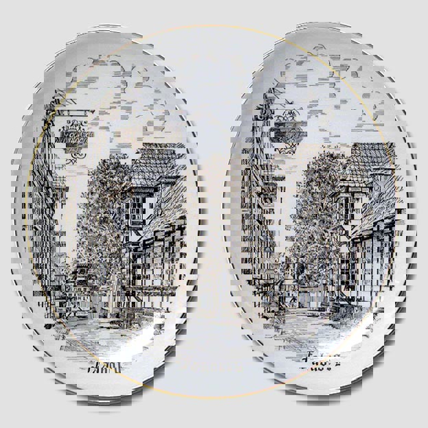 Bing&Gröndahl Teller mit brauner Zeichnung Motiv: Alte Häuser in Faaborg