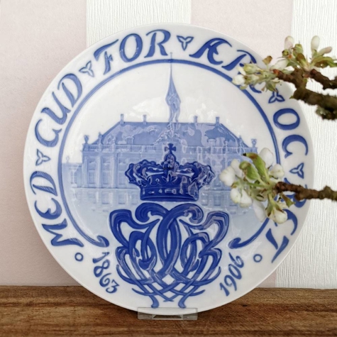 Bing&Gröndahl Gedenkteller Ausgabejahr: 1906 Motiv: Schloss Amalienborg 1863 - 1906 Durchmesser: 7,5 "- 20 cm. Der Teller erschien zum Gedenken an den dänischen König Christian IX, der zwischen 1863 und 1906 König und dessen Motto Med Gud for ære og ret (mit Gott für Ehre und Gerechtigkeit) war.