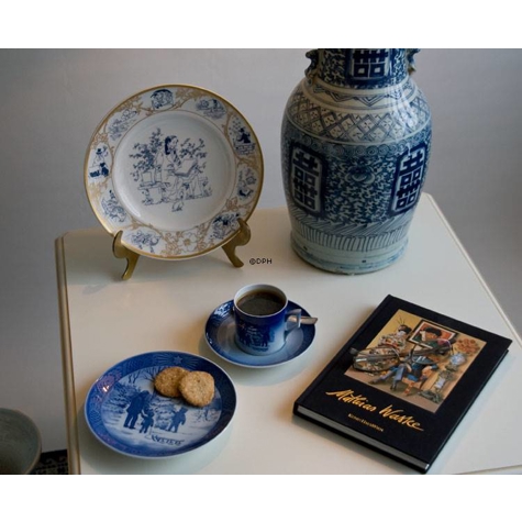 Der Teller hat ein Motiv von H. C. Andersen in der Mitte umgeben von Motiven aus neun seiner bekanntesten und geliebten Märchen. Die Dekorationen sind in Blau und Gold gehalten. Eine limitierte Produktion, die 1975 veröffentlicht wurde. Ein "Muss" für alle H. C. Andersen Fans.