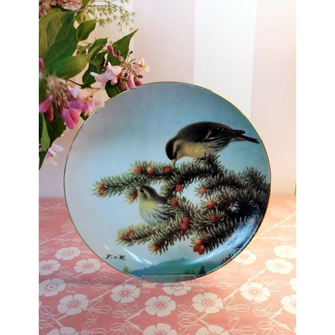 Kermansavi-Teller mit dem Titel "Grünfink" aus der Serie "Vollwertige Sänger". Das Motiv wurde nach dem Originalwerk von Ferdinand con Wright (1822-1906) auf Porzellan übertragen. Die Platte wurde 1992 herausgegeben.