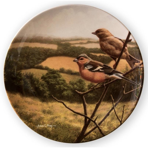 Royal Doulton Teller mit dem Titel "Serenade des Sonnenaufgangs" in der Serie "Schatz des Morgens" Motiv: Zwei Vögel auf einem Ast vor Feldern Künstler: Adrian C. Rigby