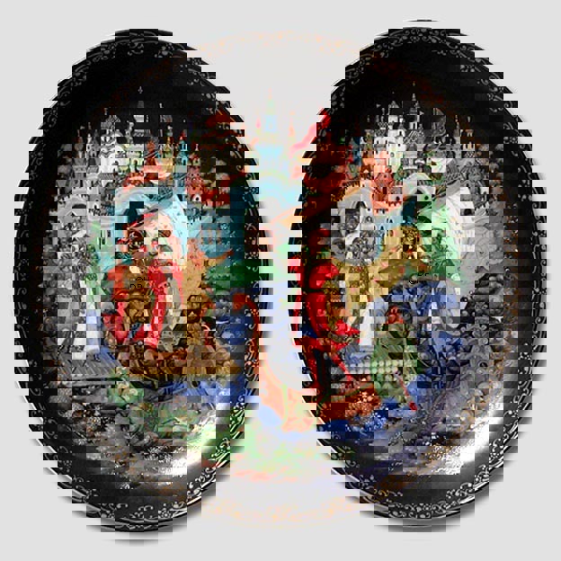 Sammlerstücke: "Russische Legenden" Palekh Kunstkollektion Teller Motiv: "Sadko" Künstler: Evgeny A. Populov Technik: Miniaturmalerei auf schwarzem Lack Ausgabejahr: 1990 Durchmesser: ca. 7,5 "- 19,5 cm