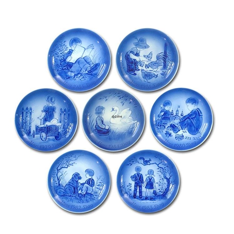 Der Titel des Desirée 1981 Muttertagstellers ist tägliche Aufgaben. Der Muttertagsteller wurde von der Porzellanmanufaktur Désirée Dänemark, auch bekannt als Désirée Denmark oder Svend Jensen von Dänemark, Old Copenhagen Blue, hergestellt. Das Motiv des Svend Jensen Muttertagtellers von 1981 wurde von Mads Stage entworfen. Es ist ein harmonisches Bild eines tief konzentrierten Jungen, der Getreide verteilt, während das Huhn eng um ihn herum geht, um es zu essen. Der Teller ist in blauem Unterglasur gemalt. Désirée Dänemark begann 1970 die Serie der Muttertagsteller und beendete sie 1994. Die Motive aller Svend Jensen Muttertagsteller wurden von Ereignissen aus der wunderbaren Kinderwelt inspiriert.