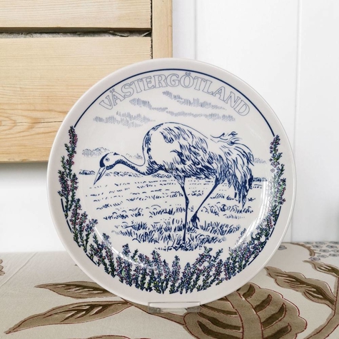 Elg Porzellan mit einem Motiv eines Kranichs und der Nationalblume (Heide) aus Västergötland.