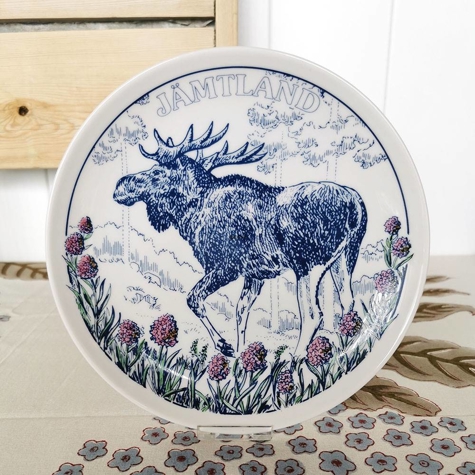 Elg Porzellan mit einem Motiv eines Elchs und der Nationalblume (Schwarze Knabenkraut) aus Jämtland in Schweden.
