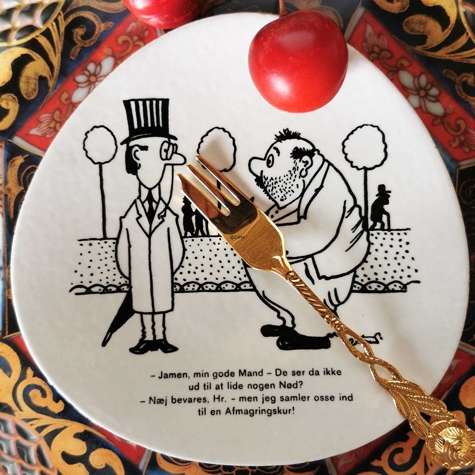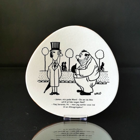 Knabstrup Storm P. Teller mit folgender Inschrift: - Nun ja, mein lieber Mann - Sie scheinen ja keine Not zu leiden? - Oh nein, Herr - aber ich sammle auch für eine Schlankheitskur! Der Teller wurde von Johannes Hansen entworfen und hat die Form eines "dreieckigen" Tellers ohne Ecken.