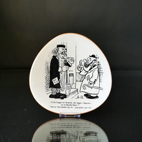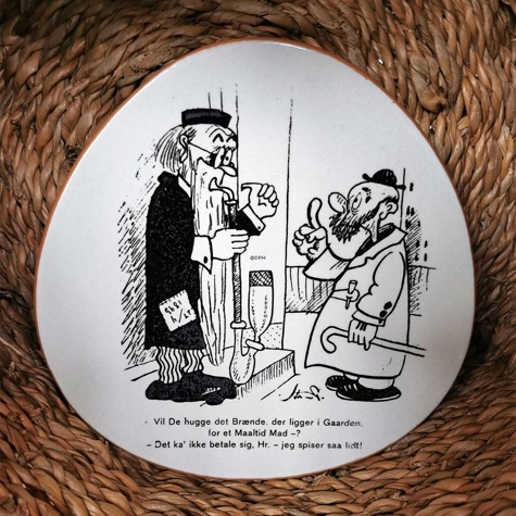 Knabstrup Storm P. Teller mit folgender Inschrift: - Werden Sie das Brennholz im Hof hacken, für eine Mahlzeit? - Es lohnt sich nicht, Herr - ich esse so wenig! Der Teller wurde von Johannes Hansen entworfen und hat die Form eines "dreieckigen" Tellers ohne Ecken.