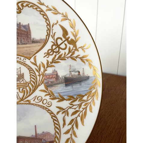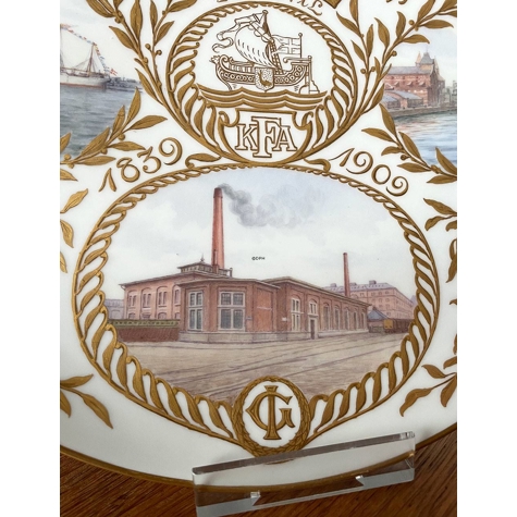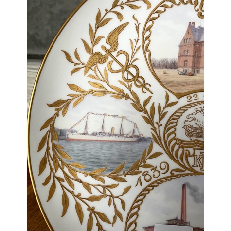 Teller zum 70. Geburtstag von Isak Glückstadt. 1839 - 22. April 1909 Der Teller hat Motive von Freihafen von Kopenhagen und der Marke KFA (Freihafen von Kopenhagen Aktiengesellschaft). Isak Glückstadt war der Hauptmann hinter dem Freihafen von Kopenhagen.