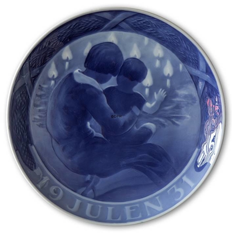 Der 1931 Royal Copenhagen Weihnachtsteller, Entwurf Gotfred Rode, trägt den Titel Kinder am Weihnachtsbaum. Der Royal Copenhagen Weihnachtsteller von 1931 ist mit einem Bild einer Mutter und eines Kindes geschmückt, die vor dem Weihnachtsbaum mit all ihren Kerzen sitzen. Royal Copenhagen Weihnachtsteller 1931 wurde nur in 1931 hergestellt.
