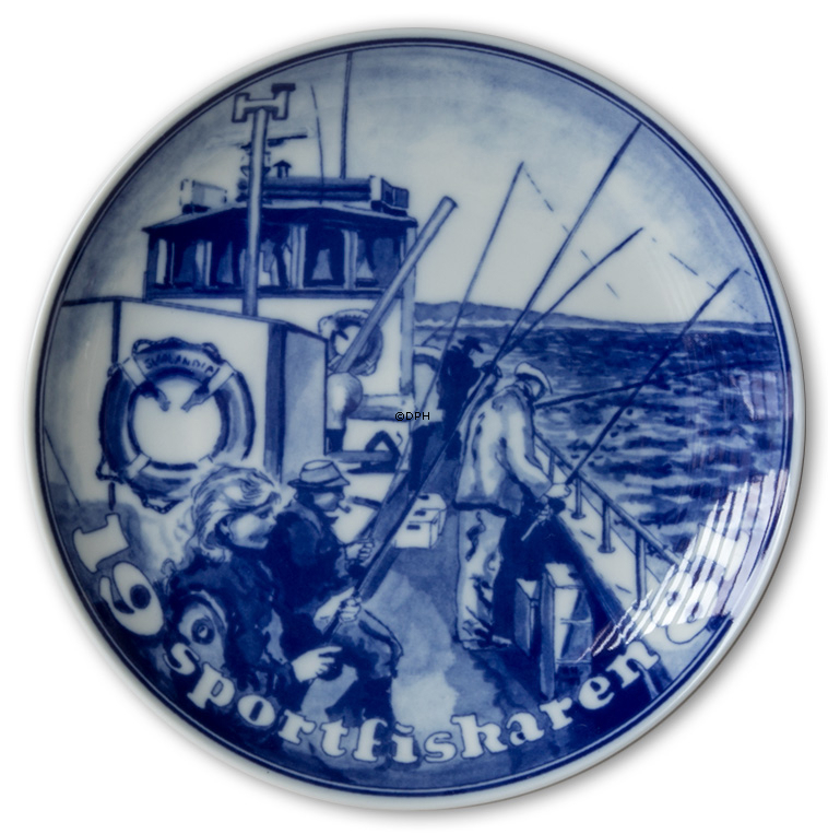 Stockbild Wexiö Fischteller 1981 in der Serie "Der Sportsfischer" mit dem Titel "Am Hornhechtplatz im Öresund". Dieser Teller wurde von Rolf Heinwall entworfen.