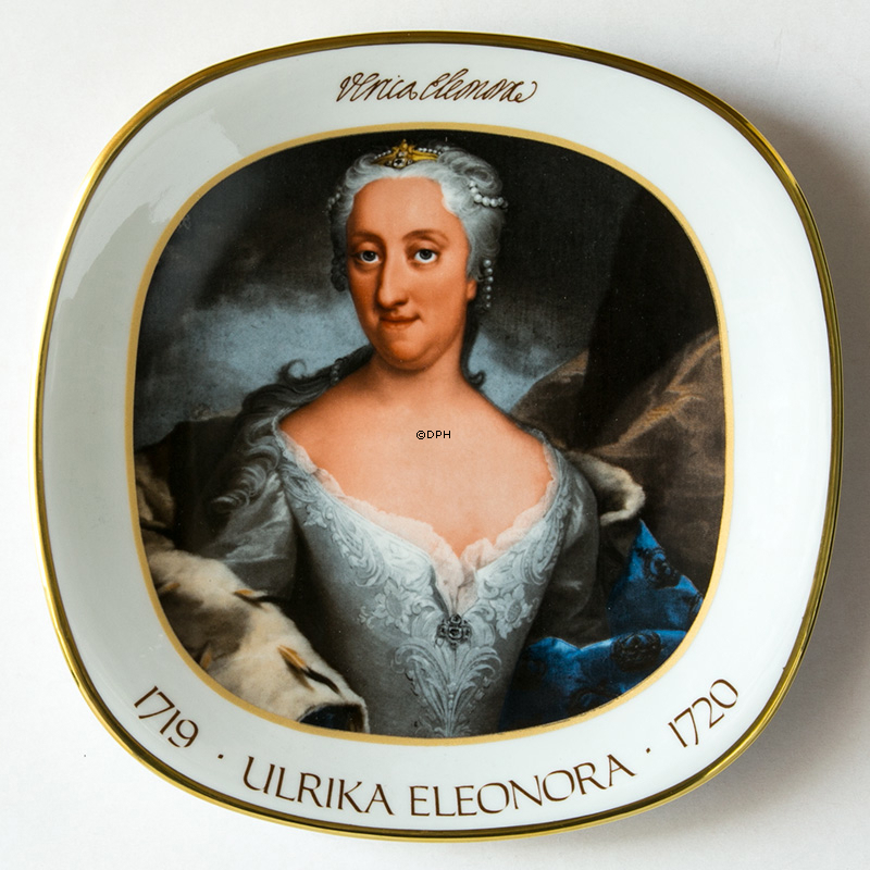 Ulrika Eleonora geboren am 23. Januar 1688 als Tochter von Karl XI und Ulrika Eleonora von Dänemark. Schwester zu Karl XII und gewählte Königin nach seinem Tod 1719. Überließ den Thron ihrem Ehemann Frederik. Gestorben 1741. Begraben in Riddarholmskyrkan in Stockholm. Motto: In Gott meine Hoffnung. Porträt von der Malerei von Martin van Meytens.
