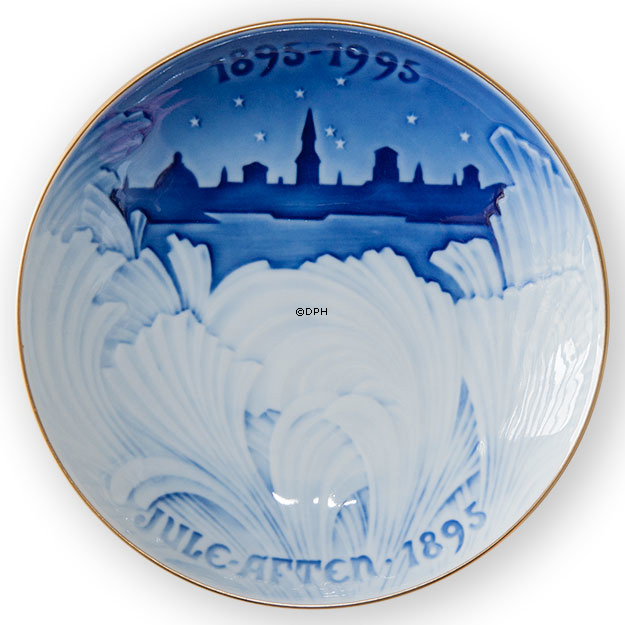 Das Motiv dieses Bing&Gröndahl jahrhunderteweihnachtstellers von 1995 ist das gleiche wie das Motiv des Bing&Gröndahl Weihnachtstellers von 1895. 1895 begann Bing&Gröndahl die erste Serie von Weihnachtsteller in der Welt. Anlässlich des 100-jährigen Jubiläums der Bing&Gröndahl Weihnachtstellerserie, die 1995 stattfand, gab Bing&Gröndahl die Jahrhundertekollektion heraus, die aus fünf Tellern besteht. Diese Teller ist die fünfte und letzte Teller in der Jahrhundertekollektion. Das Motiv der Teller ist Hinter dem gefrorenen Fenster, das von F. Hallin entworfen wurde. Das Motiv ist ein Blick über Kopenhagen von einem Fenster auf Schloss Frederiksberg, das 1704 von König Frederik IV. gebaut und als Sommerresidenz genutzt wurde. Im Hintergrund sind viele der berühmten Gebäude von Kopenhagen zu sehen, zum Beispiel der runde Turm, die Marmorkirche, die Dreifaltigkeitskirche, die Börse und die Frauenkirche. Kopenhagen wurde 1167 von Bischof Absalon gegründet, der eine Burg mit drei Türmen errichtete, wo Christiansborg sich heute befindet, und diese drei Türme gehören heute zu Stadtwappen Kopenhagens, und auch Bing&Gröndahl nutzte dieses Symbol als Marke.