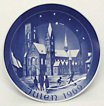 1969 Weihnachtsteller mit der dänischen Kirche Dom zu Ribe. Diese Serie von Weihnachtstellern mit dänischen Kirchen begann 1968 und endete 1990. Die für die Teller verwendete Technik ist Unterglasur.