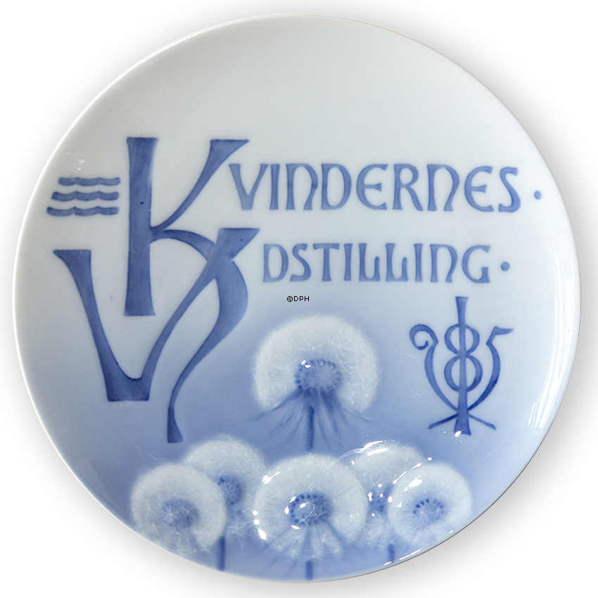 Royal Copenhagen Gedenkteller Ausgabejahr: 1895 1200 Exemplare hergestellt Technik: Unterglasur Entwurf: Arnold Krog Durchmesser: 18 cm Motiv: Frauenausstellung in Kopenhagen "Vergangenheit und Gegenwart". Inschrift: KVINDERNES UDSTILLING 1895, drei Wellenlinien und Blumenmotiv.
