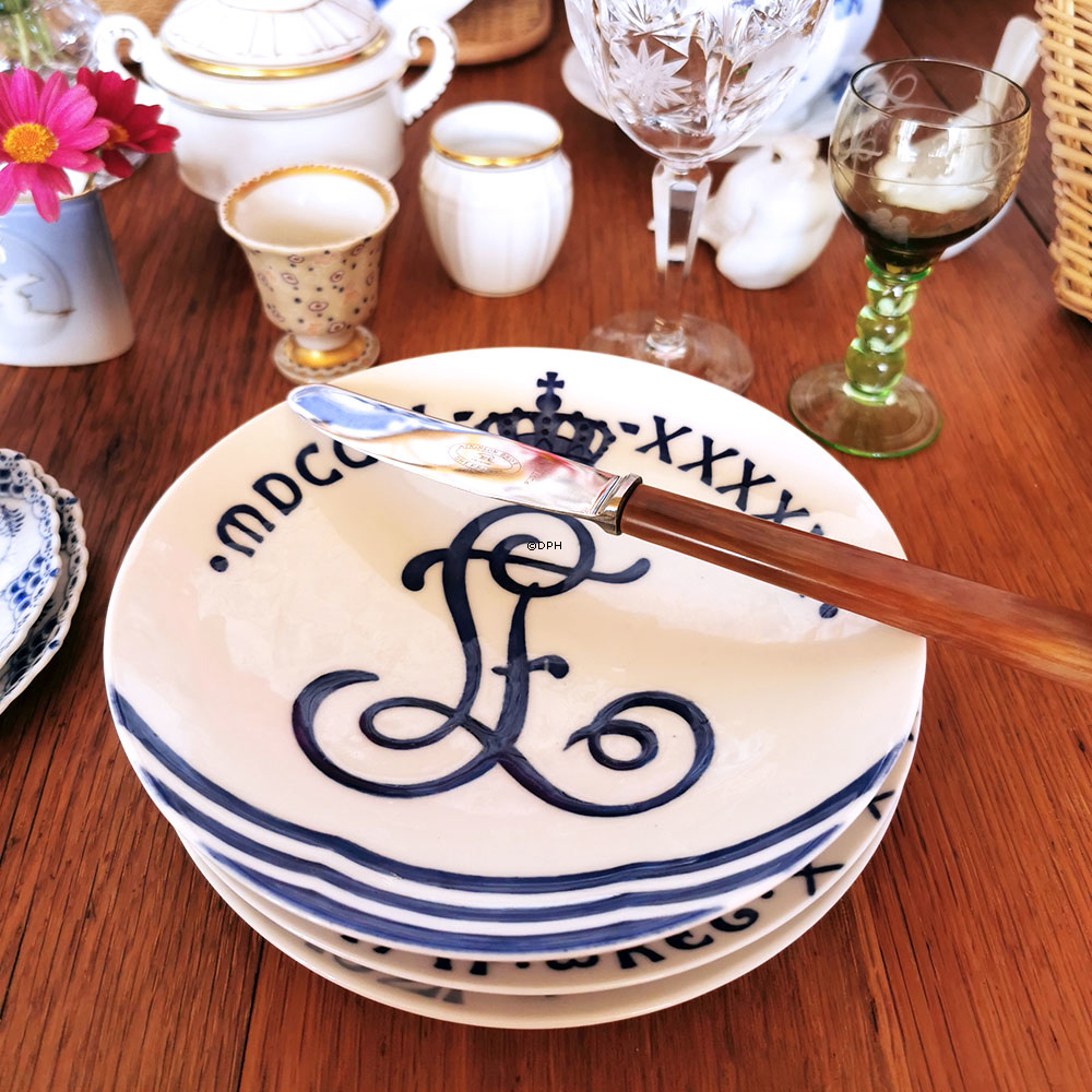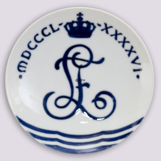 Royal Copenhagen Gedenkteller Ausgabejahr: 1896 1200 Exemplare hergestellt Technik: Unterglasur Entwurf: Arnold Krog Durchmesser: 6 3/4" Motiv: Die Hochzeit von Prinzessin Louise von Dänemark mit Prinz Friederich von Schaumburg-Lippe. Gekröntes Monogramm LF und Jahr MDCCCLXXXXVI über drei Wellenlinien