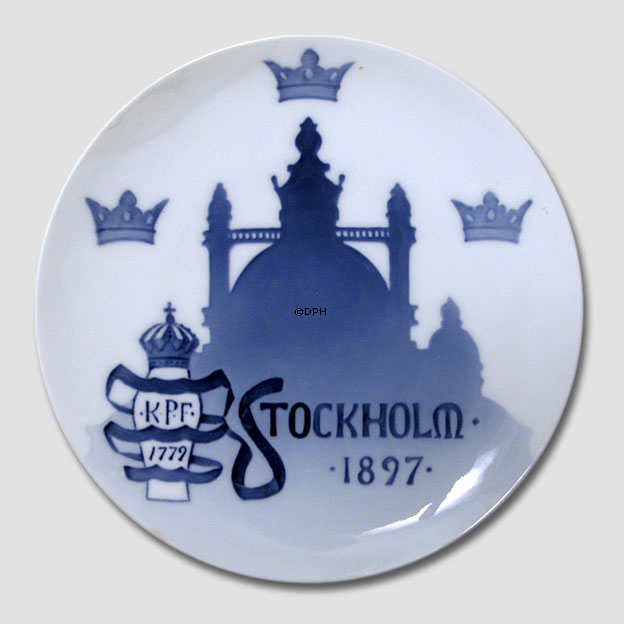 Royal Copenhagen Gedenkteller Ausgabejahr: 1897 1200 Exemplare hergestellt Entworfen von: Arnold Krog Durchmesser: 7 1/4" Motiv: Kunst- und Industrieausstellung in Stockholm. Kuppel des Gebäudes, über dem drei Kronen. Unten Inskription: STOCKHOLM 1897. Nach Links gekrönte Vase mit den Buchstaben KPF (Kongelige Porcelains Fabrik) und das Jahr 1807.