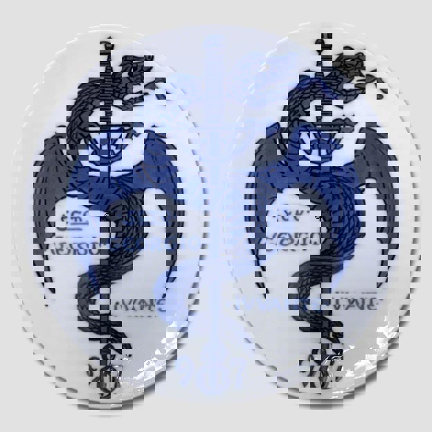Royal Copenhagen Gedenkteller Ausgabejahr: 1897 1500 Exemplare hergestellt Entworfen von: Arnold Krog Durchmesser: 7 1/4" Motiv: Drachen, durchbrochen von einem Rapier mit drei Ringen. Der Punkt bildet die Figur I im Jahr 1897. Inschrift: SCTO GEORGIO IUVANTE (mit Hilfe von Saint George). in Auftrag gegeben von der unabhängigen Odd Fellows für sein Krankenhaus auf Island.
